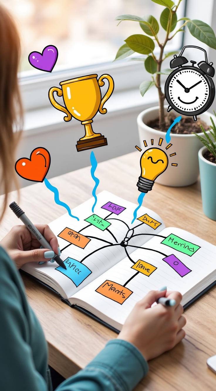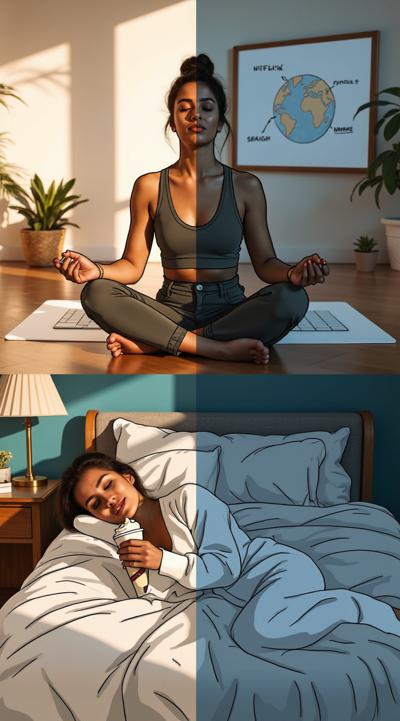 Split-screen image. Left side: An idealized, stock photo scene of a woman meditating with a neat vision board. Right side: The same woman in reality, lying in bed binging Netflix with ice cream, scrolling TikTok, with a crumpled vision board under the bed. Cinematic lighting, humorous contrast, relatable content