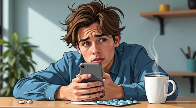 Photorealistic style, a close-up of a stressed young man or woman with messy hair, sitting at a desk, they are holding a meditation app on their phone but their eyes are wide open and glazed from scrolling social media, in front of them is a cup of cold coffee and a pill blister pack, the lighting is cold blue and grey, atmosphere of exhaustion, high detail