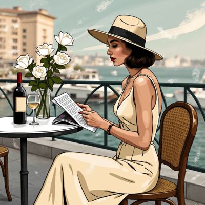 АБСТРАКТНАЯ ЖИВОПИСЬ . АБСТРАКТНАЯ ЖЕНЩИНА АРИСТОКРАТИЧНОЙ ВНЕШНОСТИ НАРИСОВАННАЯ В СТИЛЕ КАРТИН Jack Vettriano, СИДИТ В ПРОФИЛЬ В КАФЕ ЗА СТОЛОМ В КРЕМОВОМ ЛЕТНЕМ ПЛАТЬЕ И В ШЛЯПЕ В ФОРМЕ ВЕДРА МОДЫ 19050 ГОДА И ЧИТАЕТ ЖУРНАЛ, ЛЕЖАЩИЙ НА СТОЛЕ . НА СТОЛЕ БУТЫЛКА ВИНА, БОКАЛ И ВАЗА С БЕЛЫМИ ЦВЕТАМИ . ФОН КАРТИНЫ ОКНО ИЗ КАФЕ С СОВРЕМЕННЫМИ ДЕКОРАТИВНЫМИ ЖАЛЮЗЯМИ