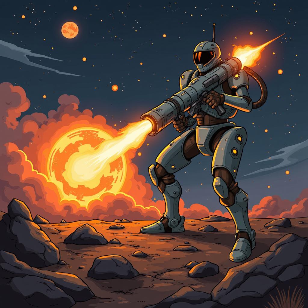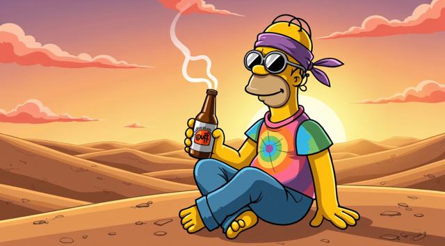Гомер Симпсон в образе хиппи 1960-х, сидит скрестив ноги на песке в бескрайней жаркой пустыне на закате. Он мирно улыбается, в круглых солнцезащитных очках как у Джона Леннона, с повязкой на голове и в разноцветной футболке тай-дай. В руке он держит запотевшую бутылку пива Duff. Небо над пустыней заполнено огромными, светящимися, замысловатыми психоделическими узорами-мандалами ярких оранжевых, розовых и фиолетовых оттенков. Триповая, умиротворенная атмосфера, стиль Симпсонов.
