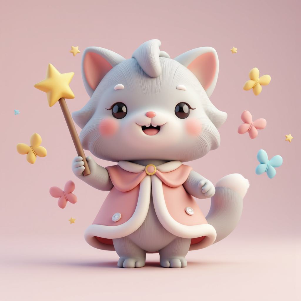 A magical silver kitty with big sparkling **joyful** eyes, standing happily on her hind legs, **smiling warmly, with a cheerful expression**. She is wearing a delicate pink cloak with white fur trim and holds a star-tipped magic wand **playfully**. Colorful butterflies flying around her **in a joyful dance**. Pure white background, magical golden sparkles and ethereal glow, cinematic bright lighting, 3D render, Pixar style, **celebratory, happy, and adorable mood**, super detailed smooth fur, fantasy art, masterpiece, 8k
