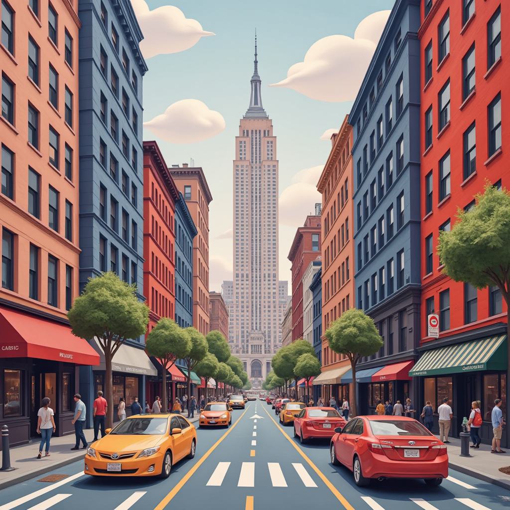 АБСТРАКЦИЯ ВЫПОЛНЕНА В ПАСТОЗНОМ ЖИРНОМ НАСЛОЕНИИ НАЛЯПИСТЫХ МАСЛЕННЫХ ПОЛОС И МАЗКОВ ОБЬЕМНОЙ ТЕХНИКЕ ЮГЕНТ СТИЛЯ , ВИД НА ЭМПАИР БИЛДИНГ СО СТОРОНЫ УЛИЦЫ РАЗНЫЕ , МАШИНЫ . ЛЮДИ , УЛИЧНОЕ ДВИЖЕНИЕ ПО ВСЕЙ КАРТИНЕ , ИНДИГО сочетается с красным, серым, коричневым, оранжевым, розовым, желтым ЧЕРНЫМ , УМБРОВЫМ