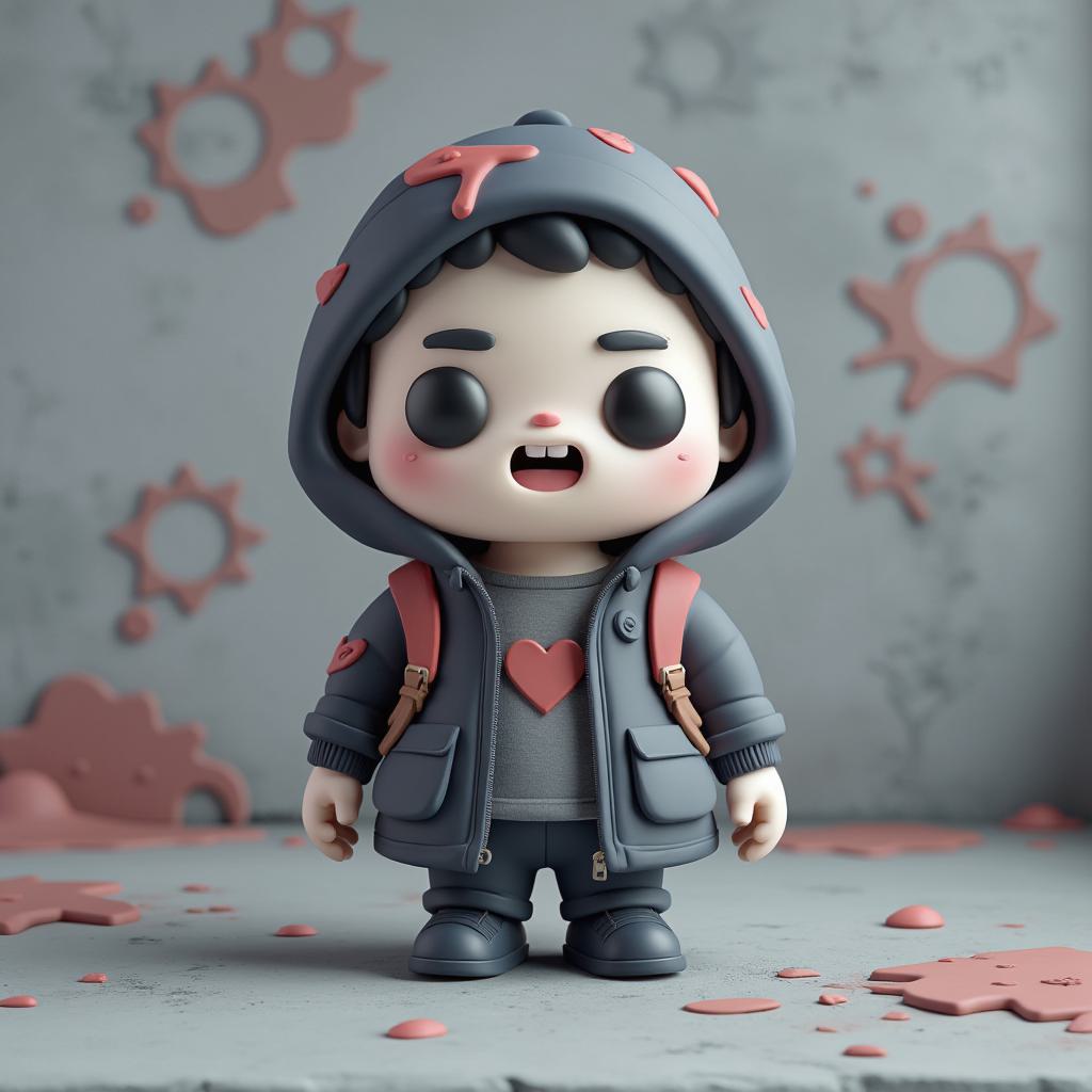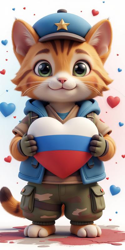 антропоморфный кот с выраженной мускулатурой. Кот одет в тельняшку и голубой берет, на лапах — камуфляжные перчатки. Он держит перед собой сердце, раскрашенное в цвета российского триколора (белый, синий, красный), символизирующее любовь к Родине. Фон открытки — динамичный, с абстрактными брызгами краски (преобладают красный, белый и синий цвета),