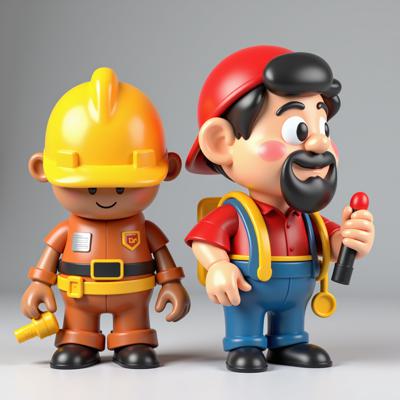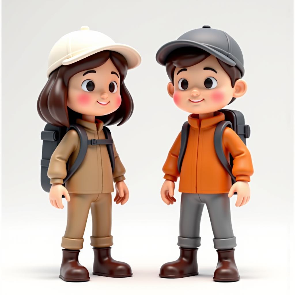 Девушка с русыми волосами по плечи, одета в туристический костюм цвета хаки с белой кепкой на голове, на спине туристический рюкзак. Рядом стоит парень в серых туристический штанах, оранжевой ветрозащитной куртке в серой кепке, с тёмно-русыми волосами. Так же с туристическим рюкзаком на спине. В мультяшном стиле, как на фигурках настольной игры