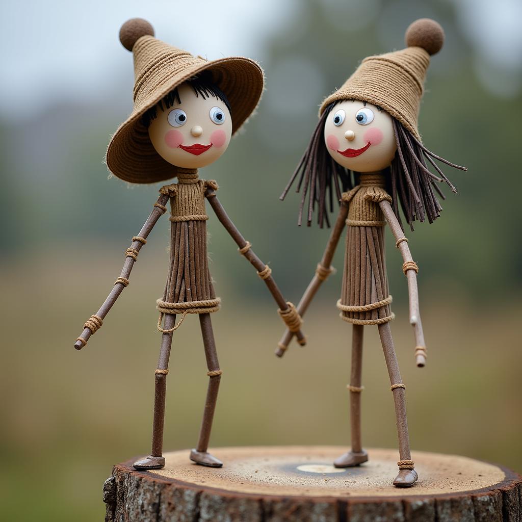 На изображении представлены две куклы, сделанные из природных материалов, которые стоят на пне. Куклы имеют простые лица с нарисованными глазами и ртами, а их тела выполнены из веток или палочек. У них на головах шапки, сделанные из веревки, и они улыбаются. Фон изображения размыт, но можно увидеть осенние листья, что создает атмосферу осени. Зю