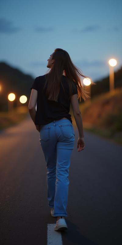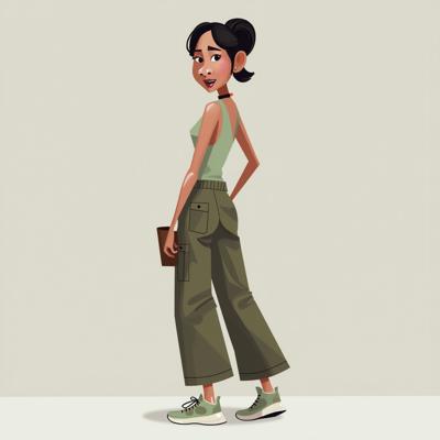 , Девушка: повернута к нам под углом 45 градусов., Стиль головы: большая голова с выразительными чертами лица., Одежда: широкие штаны-карго, легкие кеды, светлый зеленый топик., Сумка: небольшая сумочка расположена под мышкой., Прическа: волосы аккуратно уложены за ухо., Украшения: заметны аккуратные 3 круглые сережки.