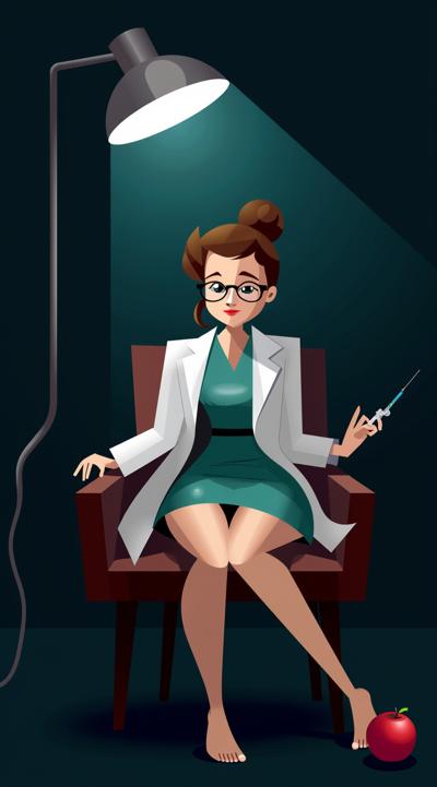 Обложка для книги. Девушка в медицинском халате сидит на кресле в позе. на ней надета мини юбка и блузка. Сзади, на каштановых волосах пучок. На лице очки. В левой поднятой вверх руке шприц,. в правой, лежащей на коленях яблоко. Вокруг темнота, ничего нет. Сверху светит лампа а в линии света летает муха. Сзади угадываются очертания морга. Черные, зеленые тона.