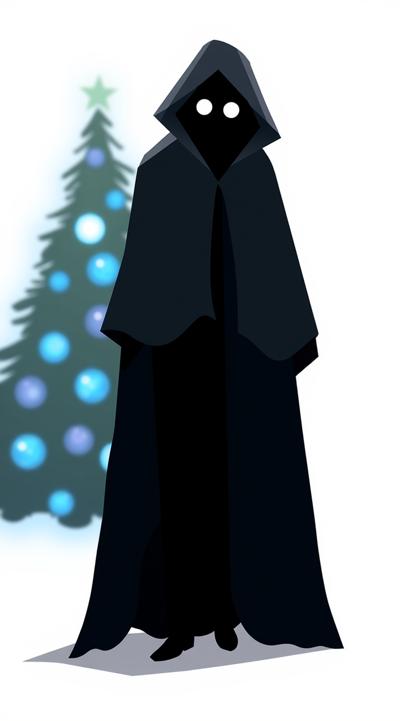 Белый фон. , На переднем плане полубоком идёт смерть. Фигура в длинном черном плаще и капишоне. Плащ полность скрывает фигуру. Из под плаща видны только круглые глаза и тьма., В забавном стиле., На заднем плане стоит рождественская ёлка, украшенная светящимися шарами. Шары светятся голубоватым светом, кроме одного. Один шар не светиться.