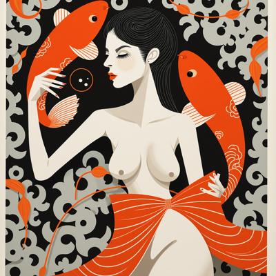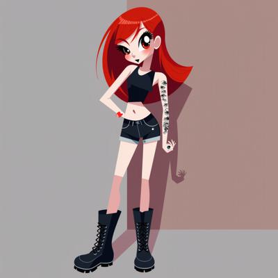 Девушка с очень милым лицом и худым телом. Она высокая 180 см и с небольшой грудной клеткой и большими бедрами. Одета с шорты и топик чёрного цвета. На ногах ботинки на высокой подошве, а так в чёрных чулках. Ее волосы покрашены в рыжий цвет, прямые до плеч. Татуированная рука рисунками глаз от кисти до плеча, а так же на ноге татуировка Ёрмунганда (скандинавский мифический змей гигант) от бедра до стопы обвивающий ее ногу. На голове кепка чёрная, а так же одеты солнце защитные очки круглые. В стиле скетч с белым фоном. Девушка стоит нагнувшись подтягився чулок на ноге, боком выгнув спину на прямых ногах, лицо вопросительное камера находит сбоку.