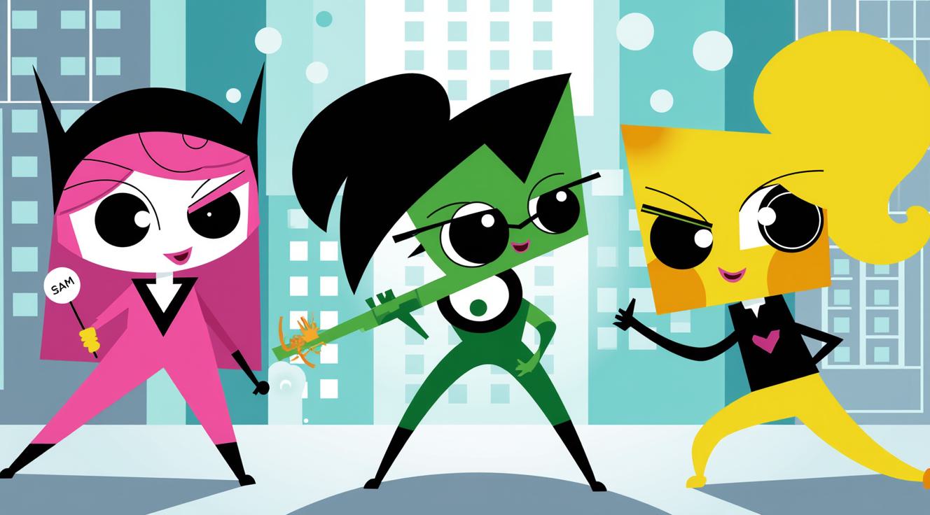 Three girl spies – Sam, Clover, and Alex – in their iconic colorful spy outfits (pink, green, and yellow), striking energetic and playful combat poses in a stylized cartoon cityscape. Bold black outlines, smooth cel-shaded coloring, expressive eyes, exaggerated proportions (large heads, slender limbs), dynamic action lines, bright and vibrant palette. Background with simplified buildings, a glowing full moon, and sparkles for emphasis. Art style faithful to early 2000s Disney Channel animation, clean linework, joyful and confident expressions, comic-book energy