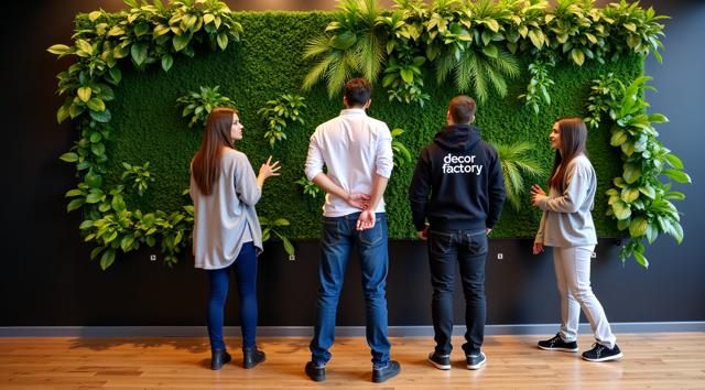 Фотография снизу вверх, сделанная под широким углом, запечатлела трех рабочих, две девушки и мужчина, занимающихся установкой вертикального сада на черной стене, расположенной на деревянном полу. В центре двое мужчин, один из которых одет в толстовку с надписью «DECOR FACTORY» на спине, стоят на черной тележке с инструментами, чтобы дотянуться до верхних частей стены. Справа женщина с длинными темными волосами, одетая в синие джинсы, тоже тянется вверх, помогая в работе. Слева за ними видна часть здания, а над ними открывается вид на пасмурное небо.