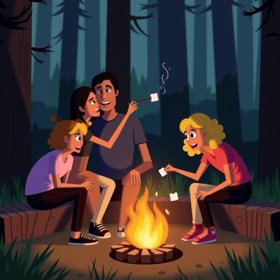 Лес друзья сидят у костра. высокий кареглазый брюнет одетый в темно синюю футболку и шорты сидит при обнимая свою девушку с блондинистыми волосами и серыми глазами, одетую в розовую кофточку и чёрные джинсы. рядом с ними сидят и жарят маршмеллоу ещё одна пара: подросток с золотистыми кудряшками и зелёными глазами, одетый в серую кофту и серые спортивные шорты, а на его плече лежит кареглазая брюнетка с кудряшками.