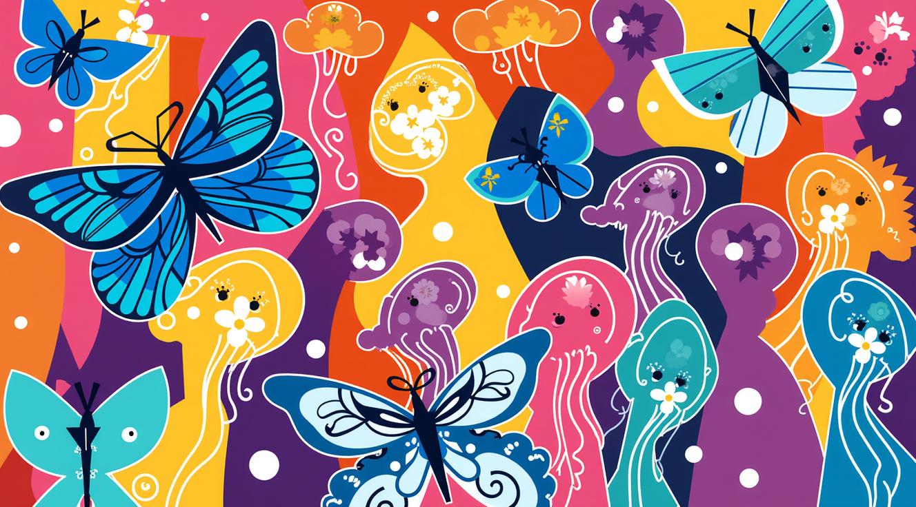 Мозаичная абстракция фрагменты повторяющиеся подогнаны друг к другу, образуя единое СОСТОЯЩЕЕ ИЗ НЕОПРЕДЕЛЕННЫХ БЕЗФОРМЕННЫХ ФИГУР В РАЗЛИЧНЫХ НАПРАВЛЕНИЯХ И РАЗНЫХ РАЗМЕРОВ , МЕСТАМИ ФИГУРЫ С НАМЕКОМ НА КРАСОЧНЫЕ БАБОЧКИ , это крупные, разделенные цветовые сегменты , С НЕБРЕЖНЫМИ КРАЯМИ , МЕДУЗООБРАЗНЫМИ