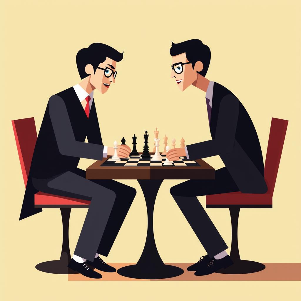 -На столе расставлены шахматы. Игроки сидят строго напротив друг друга., -Строгий стол с круглой ногой., -Мягкие строгие табуретки на круглой ноге(верх красный)., -Первый игрок: юноша в строгом, официальном костюме, галстук, очки, туфли. Прическа-классический боковой пробор., -Второй игрок: юноша в белой футболке, спортивных брюках синего цвета, кроссовках. Прическа Помпадур. Острый нос, острый подбородок. На футболке рисунок- король(одна половина белая, вторая черная)., -На игроках значки с номерами участников турнира., -Персонажи в мультяшном, 3D стиле. Верхний ракурс 70 градусов., -Строго равномерный ярко-зеленый хромакей-фон.