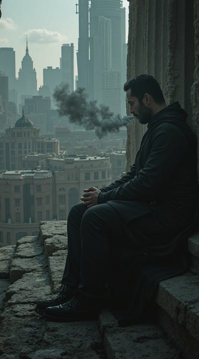"A cinematic shot of a god-like figure sitting on a throne of obsidian ruins overlooking a futuristic dark Rome. He has a calm, stoic face, eyes glowing with dim white light. He is exhaling thick grey smoke (sulfur). In the background, modern skyscrapers clash with ancient Roman columns. Dark noir atmosphere, ethereal shadows, embers falling like snow. Style: Dark Fantasy, hyper-realistic, 8k, dramatic lighting, 'Eminence in Shadow' aesthetic."