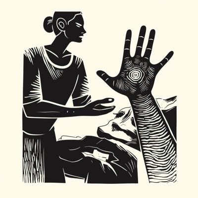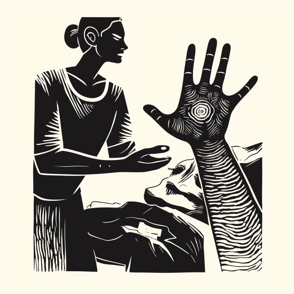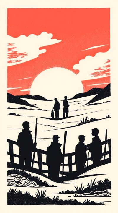 , Вы сказали:, Сгенерирую упрощенную картинку для выжигания. Стиль максимально минималистический, без каких-либо деталей, просто фигуры на фоне, условно говоря, какого-то пейзажа, и нужно, чтобы были указаны именно силуэты. Всего должно быть столько силуэтов. Ну, посередине, получается, стоит самый высокий мужчина и женщина. Мужчина за правую руку держит женщину за левую руку, соответственно, правой рукой своей. За левую руку мужчина держит другого мужчину чуть пониже, женщина, в свою очередь, за правую руку держит тоже мужчину чуть поменьше, и мужчина чуть поменьше за руку также держит ребенка в пяти лет. Ребенок мужского пола. На фоне - силуэт горы Машук с вышкой