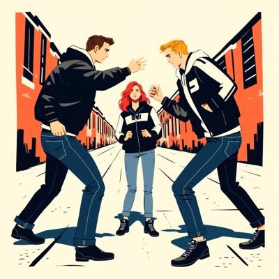 Два парня ссорятся на улице, а между ними стоит девушка с беспокойным выражением лица. Один парень - высокий блондин, широкоплечий, стройный, одет в кожаную куртку и джинсы. Второй парень - чуть ниже ростом, широкоплечий , крепкий шатен, одетый в спортивную куртку с капюшоном и джинсы. Девушка - с каштановыми длинными волосами, одета в короткую лёгкую курточку и джинсы. На фоне: осень, вечер, двор дома., Рисунок в жанре молодёжный любовный роман