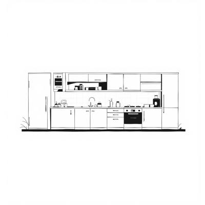 Technical vector drawing of a modern style kitchen set, precise architectural blueprint, , front elevation view, clean black and white line art, no shading, no textures, , minimalist technical CAD style, scalable vector graphics, Vector technical drawing of a modern modular kitchen cabinet set, architectural furniture blueprint, , clean CAD-style black and white linework, precise proportions, scalable vector format,