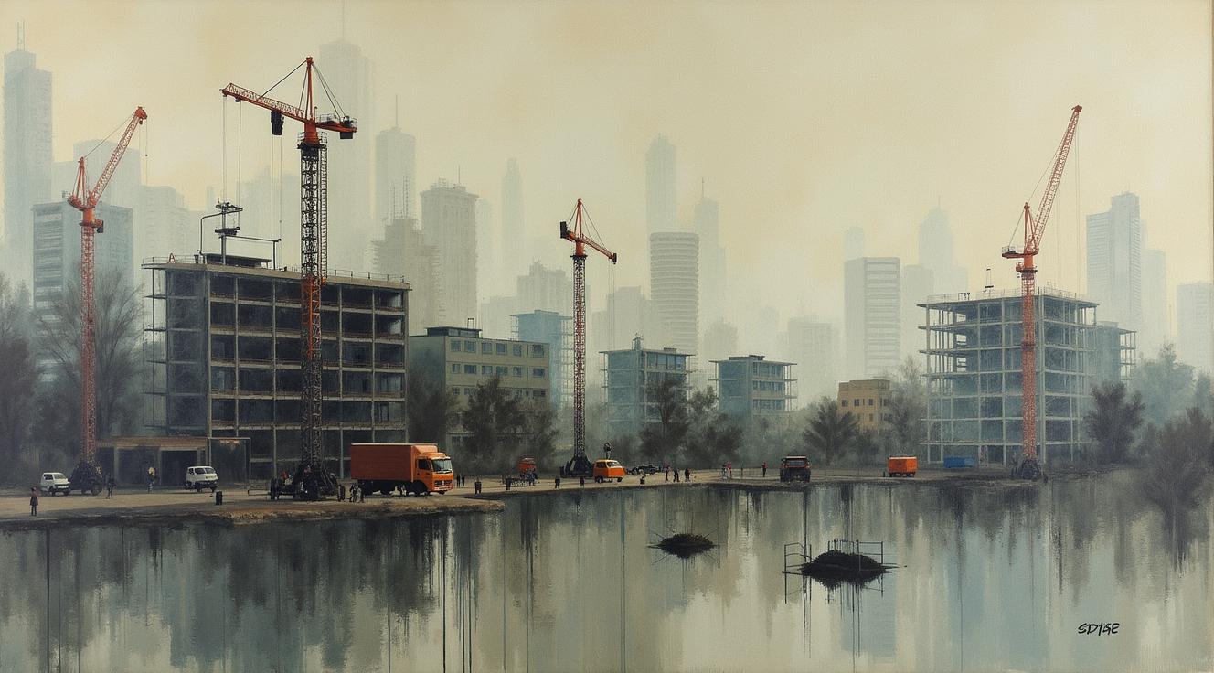 Нарисуй картинку для заднего фона главной страницы сайта организации, которая занимается ведением документации на строительных объектах. Картинка должна быть без лиц людей, в стиле абстракции, в приглушенных тонах, частично отражая работу организации со строительной документацией. Картинка должна быть в размерностях 1680х900 несколько вариантов