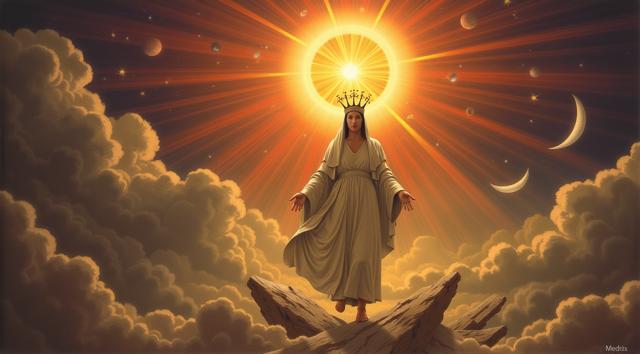 И явилось на небе великое знамение: жена, облеченная в солнце; под ногами ее луна, и на главе ее венец из двенадцати звезд., 2, Она имела во чреве, и кричала от болей и мук рождения., Откр 20,2, Откр 13,1, Откр 17,3, 3, И другое знамение явилось на небе: вот, большой красный дракон с семью головами и десятью рогами, и на головах его семь диадим.