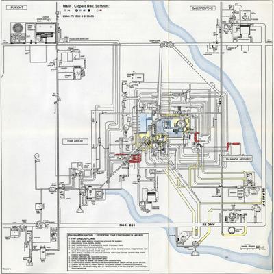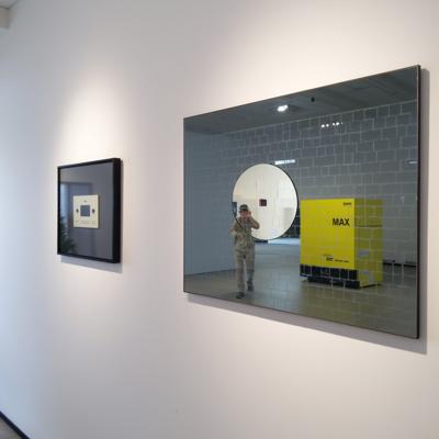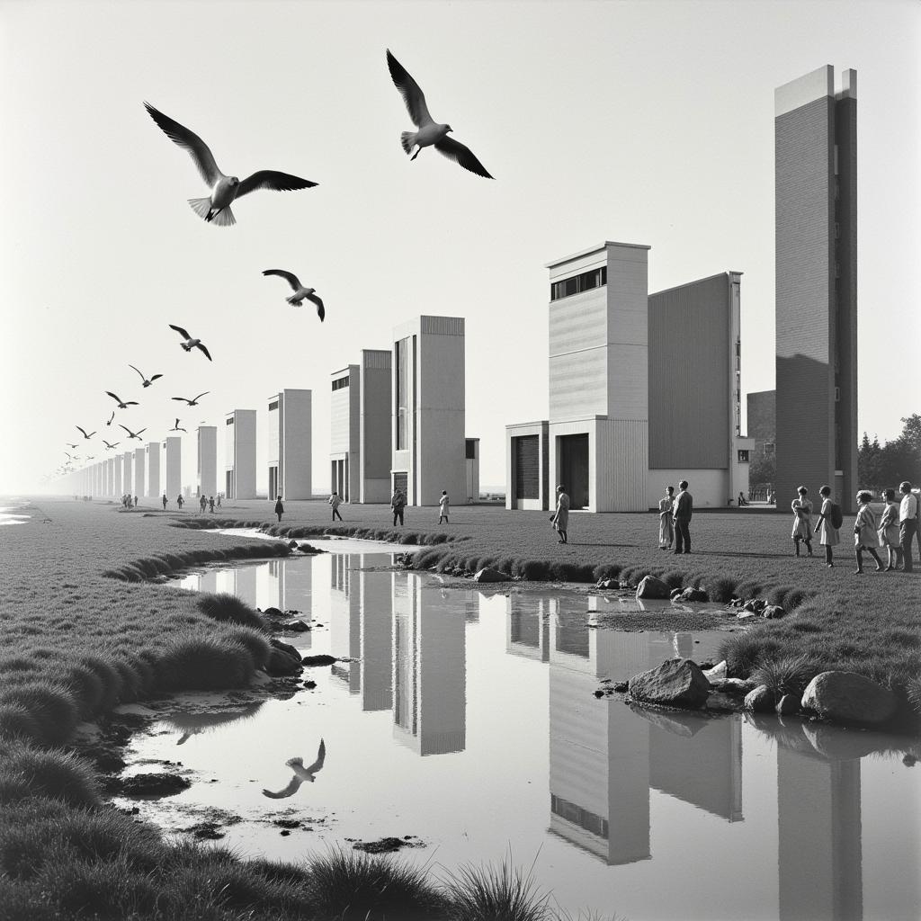 A surreal collage featuring a blend of monochrome architectural elements and natural landscapes. The central theme is 'mirror|dam lost in reflections,' with fragmented reflections and distorted perspectives. Incorporate elements like seagulls flying, a long train of buildings, people interacting with installations, and abstract watercolor splashes. The overall mood should be thought-provoking and slightly melancholic, with a strong emphasis on light and shadow play