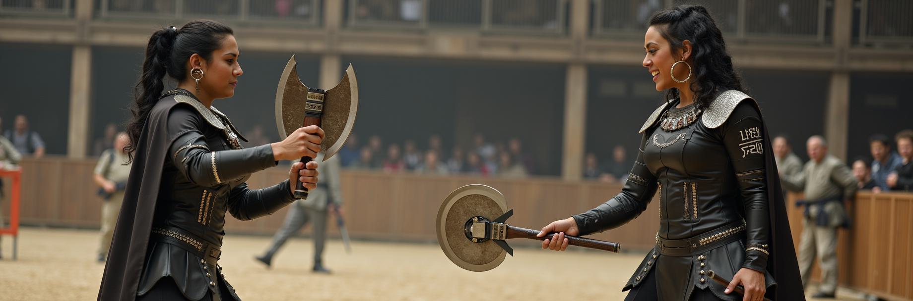 paolo serpieri alessandro barbucci, cyberpunk 2077, на арене виртуального колизея, фигуристая очень высокая женщина отражает удар молота большого боевого яростного робота-кентавра, эстетический ракурс, спадающий шелковый халат, высокотехнологичный неоготический протез руки с плазменным мечом, вид сверху, многофрактальное голографическое узловое переплетение монострочки цифрового виртуального кода в гравимерном пространстве хаотических отражений