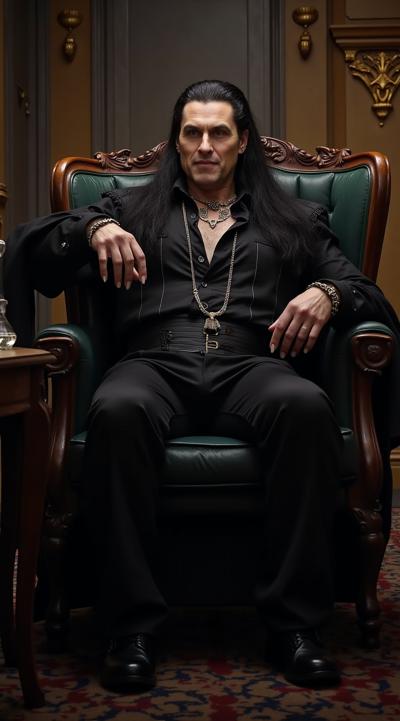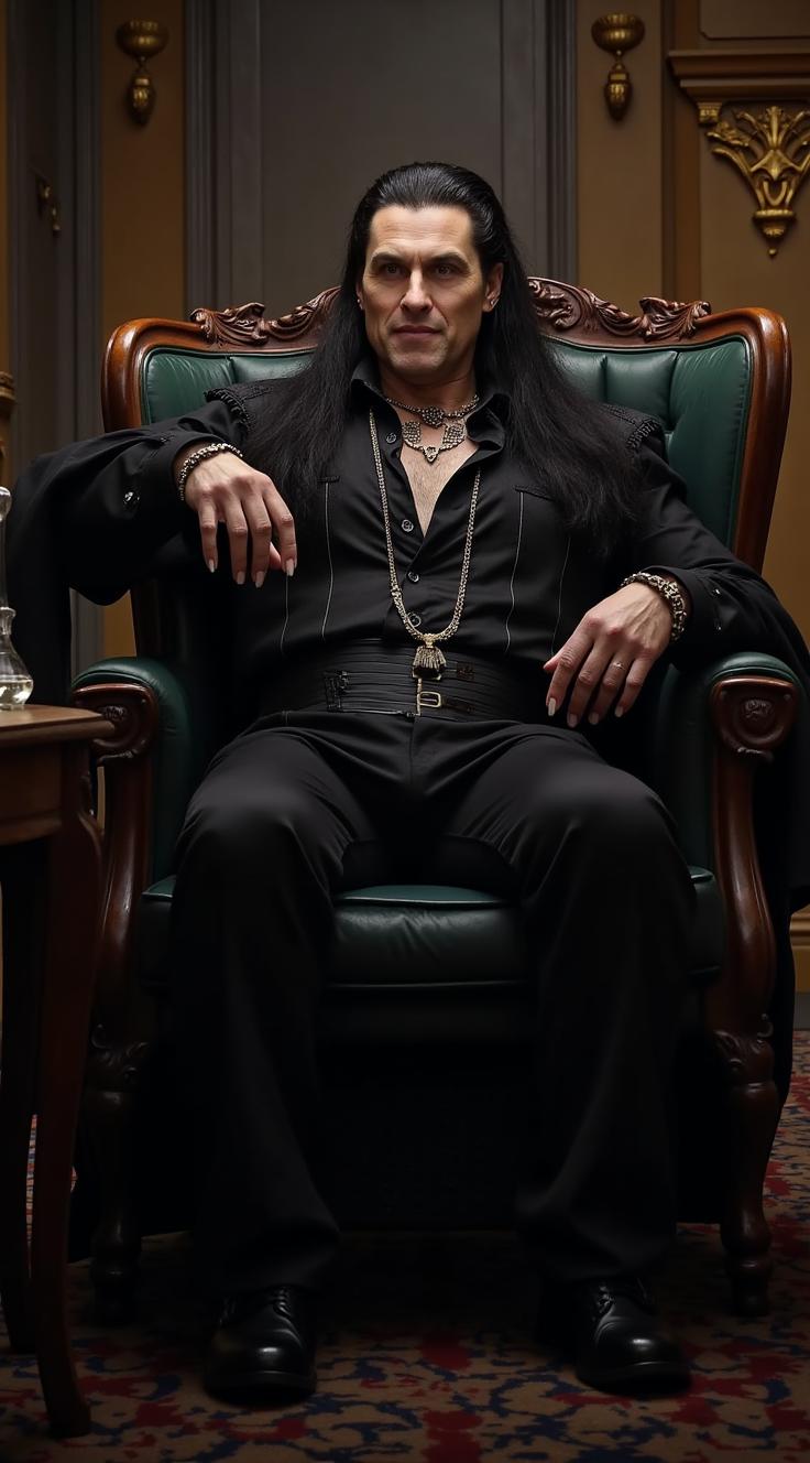 высокий широкоплечий мужчина, вампир, Мистика, дарк фэнтези, темные благородные цвета, динамичное освещение, элементы архитектуры, украшения и одежда в стиле фэнтези, длинные когти, длинные густые волосы собраны в прическу, на лице легкая улыбка, спокойный взгляд, благоробство, сидит в кресле с бокалом вина, в полный рост, эффект движение, в пол оборота, естественное освещение. темные благородные цвета одежды, нтези, готика, высокое качество и детализация, во весь рост