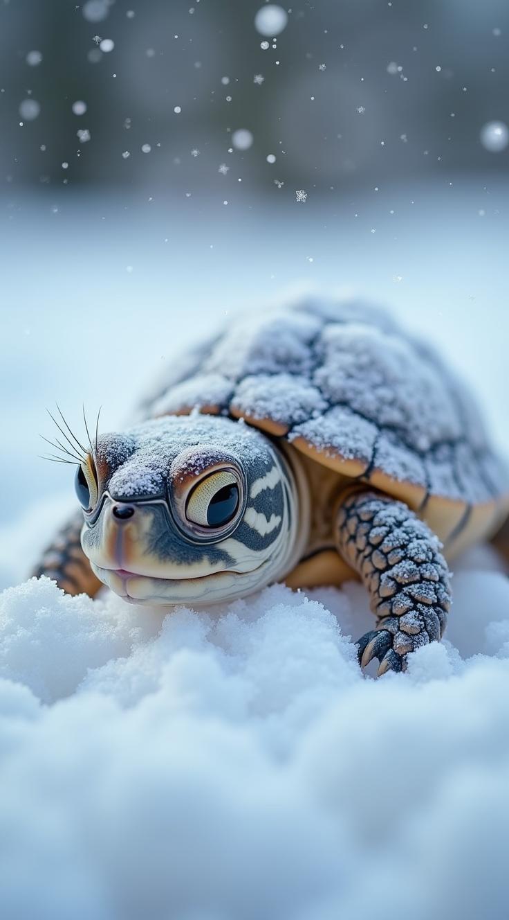 Очень реальная фотография, снята на fujifilm X-T5. К4. Снято в студии. изображен светлый сияющий светящийся маленький умилительный пушистый детеныш черепахи в припорошенном снежке, в бриллиантовой, хрустальной и жемчужной пыли и с большими умилительными глазами и ресницами. Детёныш черепахи лежит на траве на фоне белых еловых пушистых веток и раздвигает ножки в разные стороны. Новогодняя тема. Супер фантазия. Элита, богема, манерность, красота, аристократизм. Гиперреалистичность, супердетализация, стиль vogue, intricate