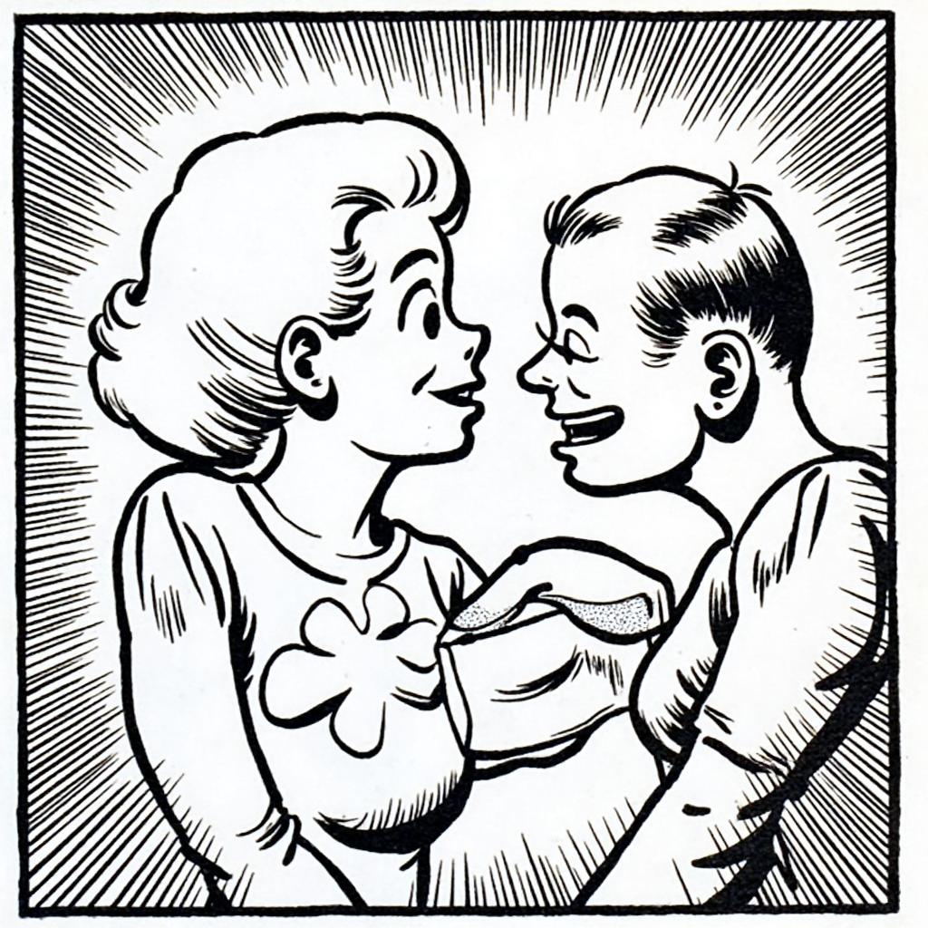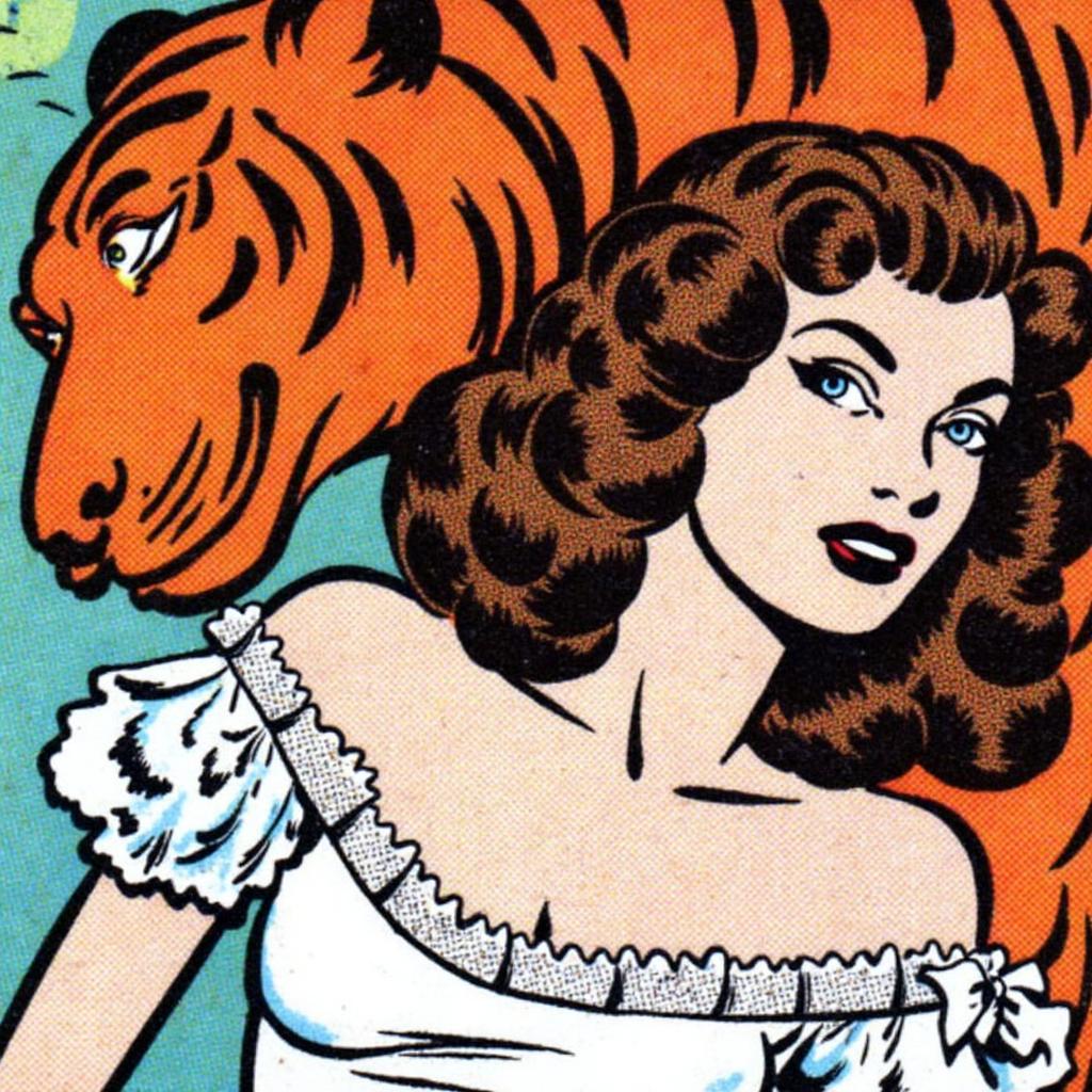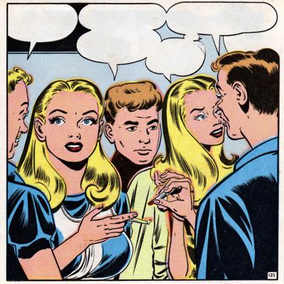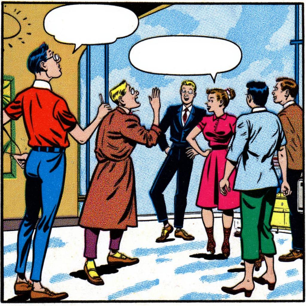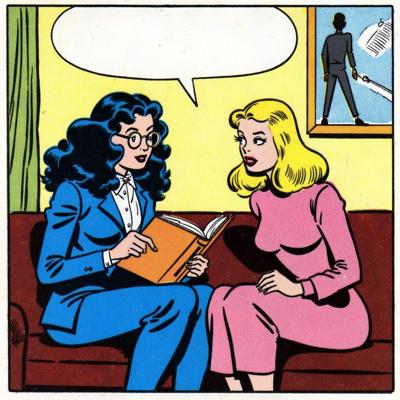 Сверху оставь пространство для будущего текста, на диване сидят две девушки. У одной светлая кожа, темные длинные кудрявые волосы и очки, она одета в голубой брючный костюм и читает книгу. Рядом сидит вторая девушка, у нее пухлые губы, светлые волосы ниже плеч подстрижены каскадом, она одета в красном платье, развалилась на диване и смотрит вверх, губы накрашены красным
