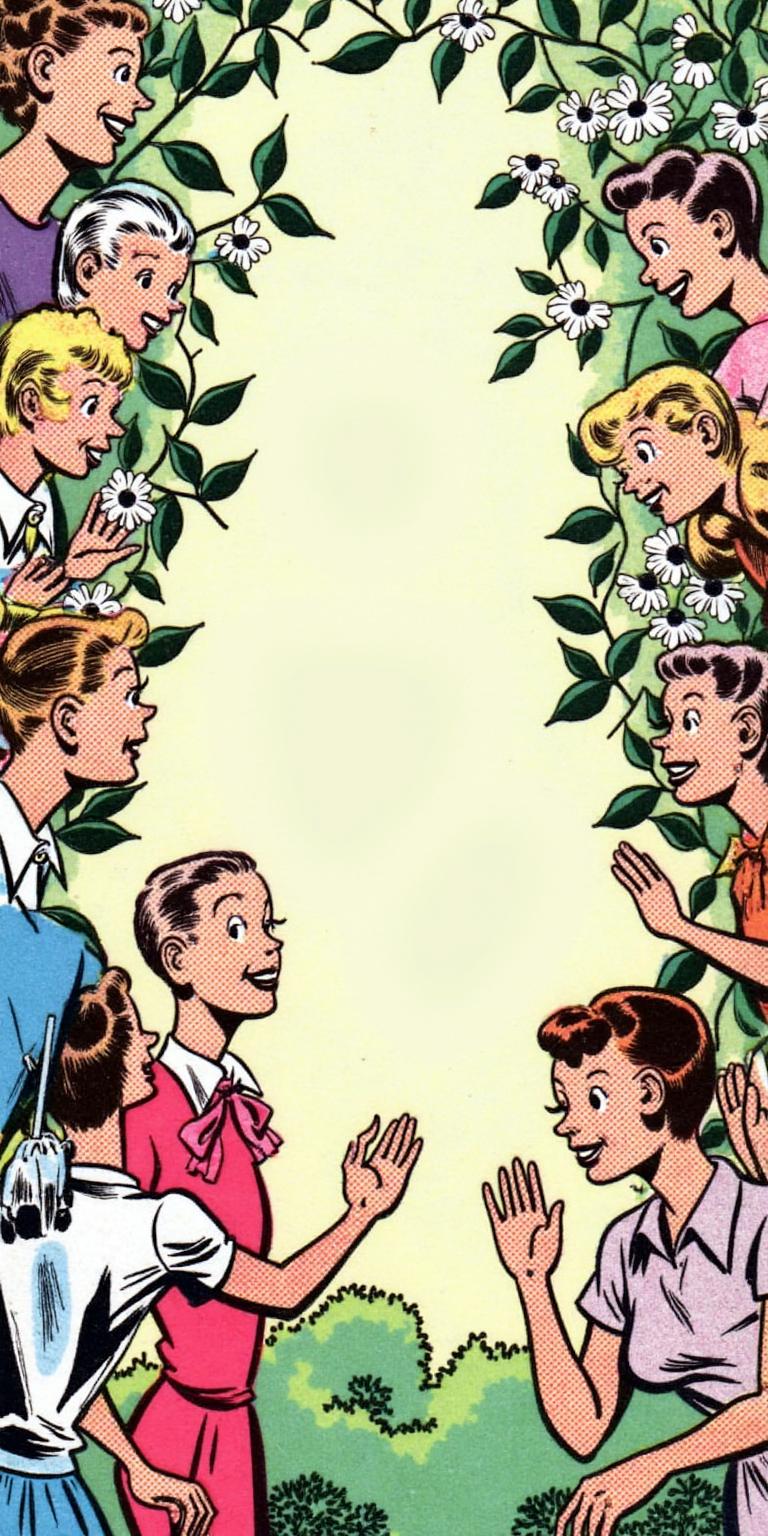 Festive composition for March 8: lush floral background in spring hues (pastel pink, green and white). White-skinned women of different ages cautiously peek out from both sides of the frame, their faces lit up with warm, sincere smiles. Some are waving their hands in greeting, others are holding bouquets of seasonal flowers (tulips, mimosas, hyacinths). The atmosphere is joyful and festive, expressing appreciation and recognition ("Well done!"). Soft diffused lighting creates a gentle glow. Style: Illustration, High detail, 4K