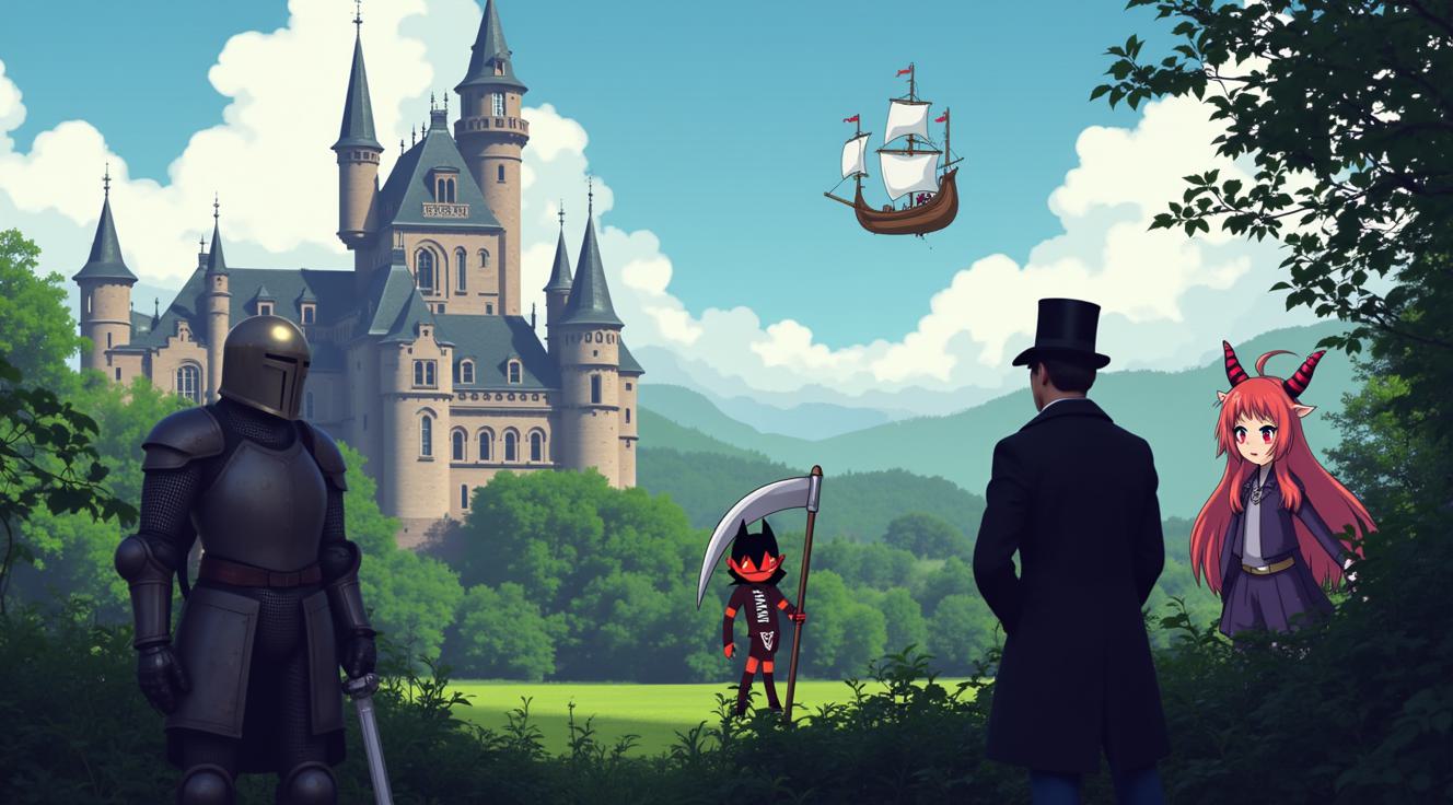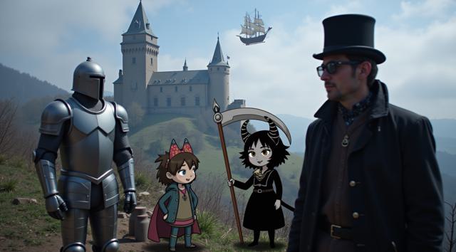 Сделай фон для превью на видео для ютуба. Изобрази на фоне готитческий замок и летающий корабль. Внизу крупным планом 3 персонгажа выполненых в разных стилях: Рыцарь в латах, изобрази его в стиле pixel art. демона девушку с косой в аниме стиле. И джентьмена в цилиндре и пальто, эго в стиле steam punk. Оставь сверху место для названия