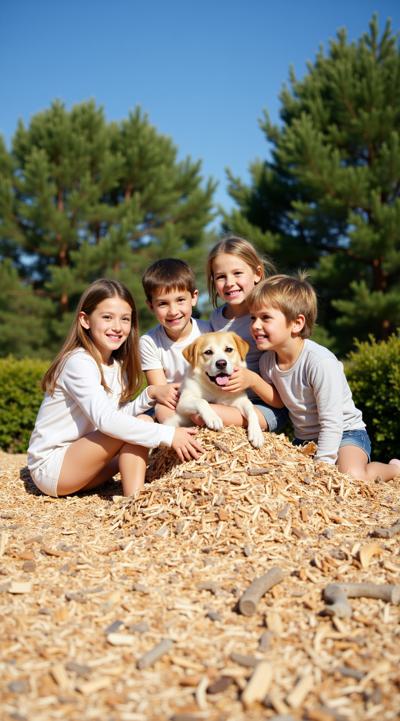 несколько детей возраста 10 и 12 лет сидящие на куче древесной стружки светлого цвета и играют с собакой. Они улыбаются и смотрит прямо в камеру. На заднем плане видны зелёные деревья и голубое небо, создающие ощущение летнего дня. Дети одеты в лёгкую одежду, что подчёркивает их расслабленное и радостное настроение.,
