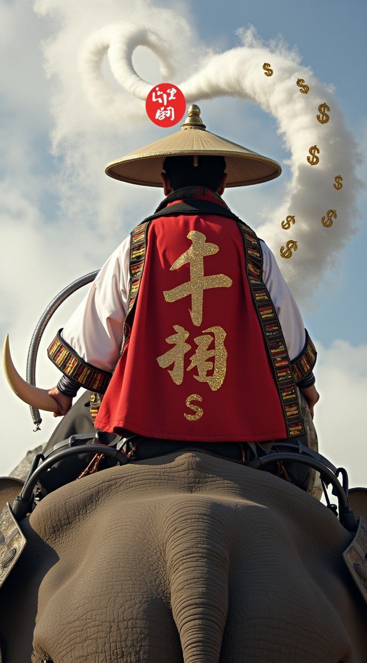 Могущественный лидер в красно-белом плаще шиноби, на спине которого золотом вышиты иероглифы: 油 (Нефть), 軍 (Армия), 金 (Золото), $ (Доллар). На голове — широкополая шляпа Каге с ярко-красным кандзи 魔賀 (МАГА). Он стоит на голове гигантского бронированного Слона с бивнями из золота. Рядом клубится цифровая аура Демона-Лиса (Илона Маска) с хвостами из спутников и молний. Каге активирует технику «Стена Границы», воздвигая из земли монументальный барьер, и сжигает радужные свитки «Корня» Камалы и Данзо-Байдена. Вокруг него — элитное АНБУ-ЦРУ в цифровых масках. Стиль: эпическое аниме, высокая детализация, атмосфера власти, триумфа и золотого свечения.