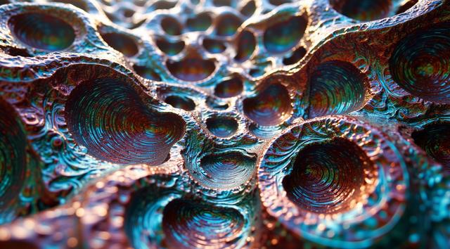 , A boundless, intricate abstract landscape unfolds with an ornate 3D extrusion, featuring swirling patterns, fluid shapes, and vibrant colors, reminiscent of a kaleidoscope, with a mesmerizing metallic sheen and subtle gradient effects, evoking a sense of futuristic and otherworldly beauty, with delicate, lace-like tendrils and ornamental filigree details that evoke a sense of ancient, mystical knowledge, set against a deep, rich, velvety black background that seems to pull the viewer in, inviting exploration of the infinite, dreamlike realm within.