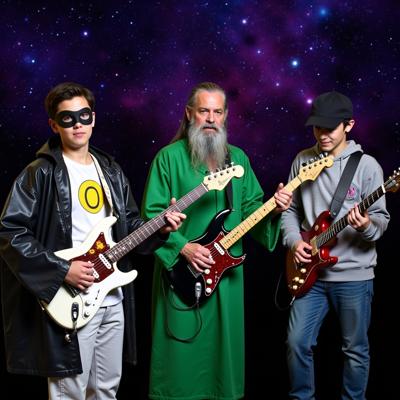 На фоне вселенной Три эгоиста играют на гитаре. Первый - парень молодой в супергеройском костюме: белый костюм с буквой О на груди и в чёрном плаще. Второй - старик в изумрудной мантии с седыми волосами и седой бородой до груди. Третий - белый молодой парень-рэпер: в кепке с прямым козырьком и кофте на размер больше