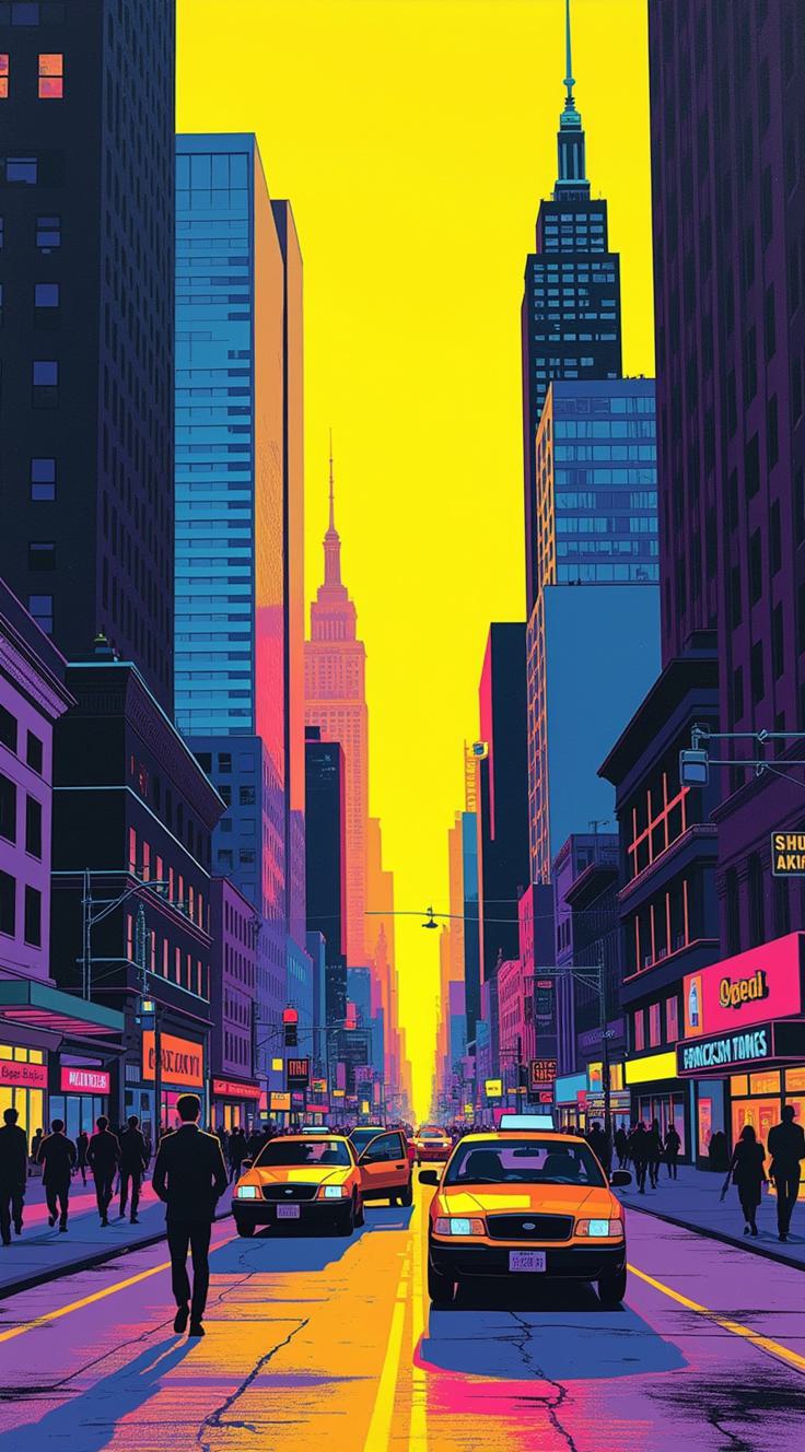 Абстрактная ЖИВОПИСЬ показывающая Нью Йоркскую улицу с видом на небоскребы с машинами и людьми , витринами и магазинами или намек на борьбу с подсознанием сюжета , представленный в сюрреалистической перспективе . Палитра желтый сочетается с синим, лиловым, светло-голубым, фиолетовым, серым, черным. ,