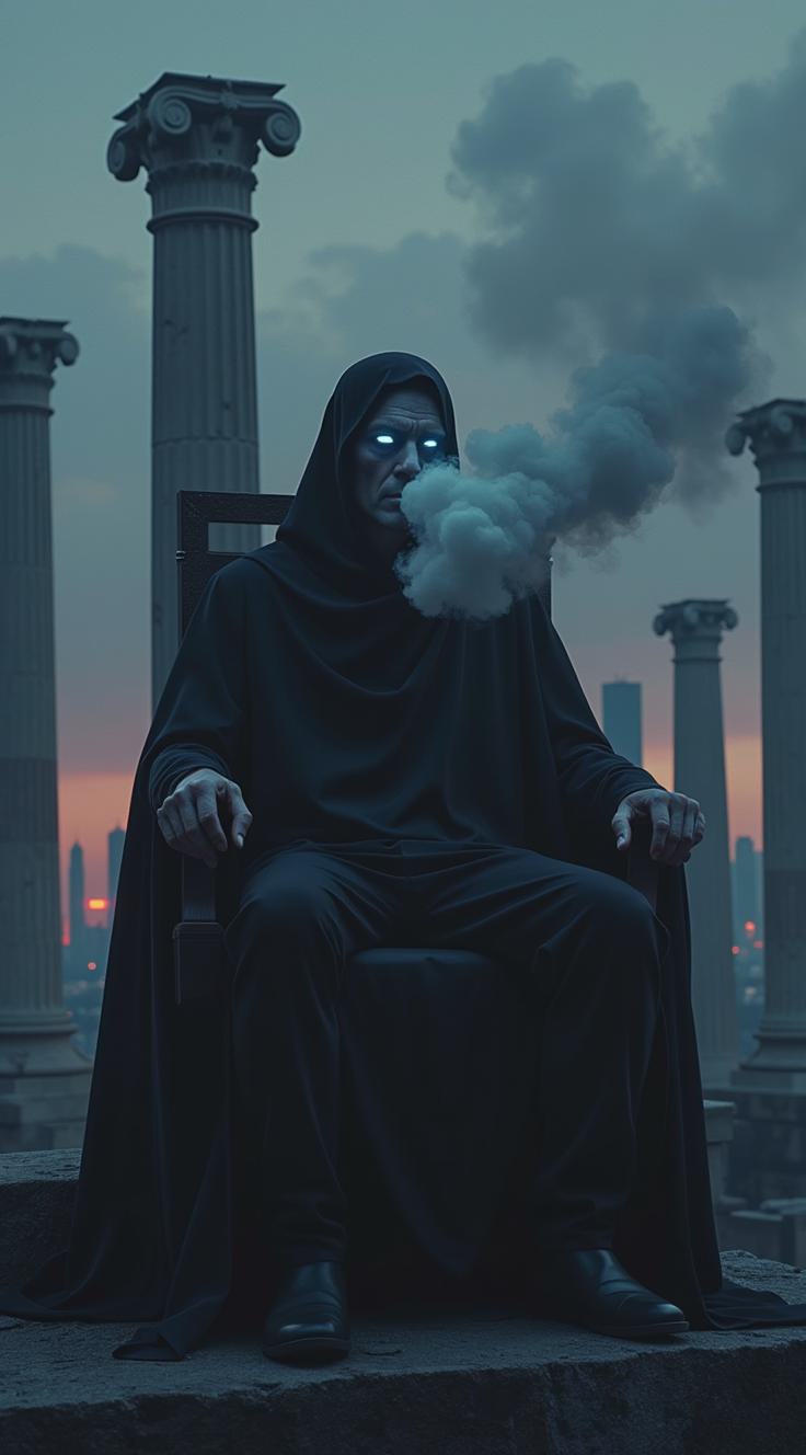 "A cinematic shot of a god-like figure sitting on a throne of obsidian ruins overlooking a futuristic dark Rome. He has a calm, stoic face, eyes glowing with dim white light. He is exhaling thick grey smoke (sulfur). In the background, modern skyscrapers clash with ancient Roman columns. Dark noir atmosphere, ethereal shadows, embers falling like snow. Style: Dark Fantasy, hyper-realistic, 8k, dramatic lighting, 'Eminence in Shadow' aesthetic."