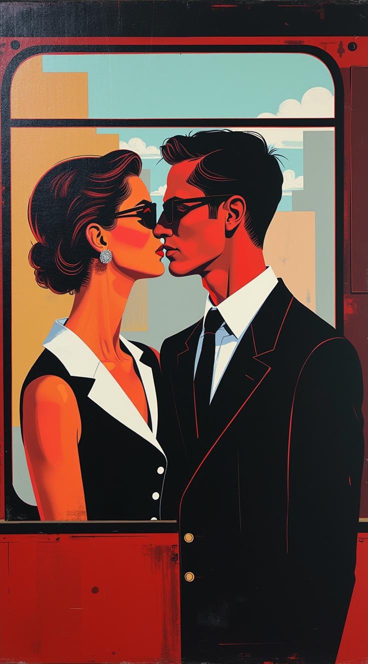 АБСТРАКТНА ЖИВОПИСЬ, НАРИСОВАННАЯ В СТИЛЕ КАРТИН Jack Vettriano. В ОКНЕ АВТОБУСА ВИДНЫ ЖЕНЩИНА И МУЖЧИНА ЗАКЛЮЧЕНЫ В ОБЬЯТИЕ В ПОЦЕЛУЕ, В СОЛНЕЧНЫХ ОЧКАХ, ОДЕТЫЕ ПО МОДЕ 1950 ГОДА. ВИДНЫ СО СТОРОНЫ ОКНА ГОРОДСКОГО АВТОБУСА. ЖЕНЩИНА, ОДЕТАЯ В БЕЗРУКАВНОЕ ЧЕРНОЕ ПЛАТЬЕ С БЕЛЫМ ВОРОТНИКОМ И ПУГОВИЦАМИ, СТОИТ ДЕРЖАСЬ РУКАМИ ЗА ОТКРЫТОЕ АВТОБУСНОЕ ОКНО. МУЖЧИНА СИДИТ, ОДЕТ В БЕЛУЮ РУБАШКУ СИДИТ. НА АВТОБУСЕ ГЕРБ ЭМБЛЕМА АВТОБУСНОГО ПАРКА