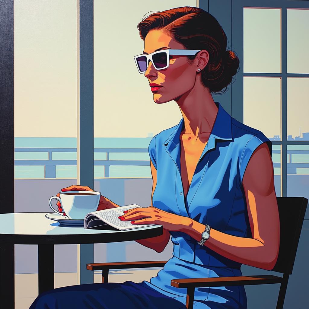 АБСТРАКТНАЯ ЖИВОПИСЬ . АБСТРАКТНАЯ ЖЕНЩИНА АРИСТОКРАТИЧНОЙ ВНЕШНОСТИ НАРИСОВАННАЯ В СТИЛЕ КАРТИН Jack Vettriano, СИДИТ В ПРОФИЛЬ В КАФЕ ЗА СТОЛОМ В СИНЕМ ЛЕТНЕМ ПЛАТЬЕ И БЕЛЫХ СОЛНЕЧНЫХ ОЧКАХ В ТОЛСТОЙ ОПРАВЕ МОДЫ 19050 ГОДА. В РУКАХ У ЖЕНЩИНЫ КРУЖЕЧКА КОФЕ И ЖУРНАЛ. ФОН КАРТИНЫ ОКНО ИЗ КАФЕ С СОВРЕМЕННЫМИ ДЕКОРАТИВНОЙ АБСТРАКЦИЕ, РЕКЛАМНОЙ ВЫВЕСКОЙ. НА БЛИЖНЕМ ПЛАНЕ НЕБОЛЬШОЙ ФРАГМЕНТ АВТОМОБИЛЯ