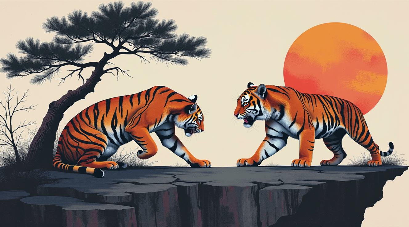 В представленном картине наблюдается сочетание элементов сюрреализма, абстрактного импрессионизма и минимализма. Композиция включает образ двух напряженных, крадущихся тигра, расположенных на фрагменте утёса, на фоне ветки сосны. Цветовая палитра ограничена и выдержана в чёрных, серых, светло-коричневых и охровых тонах, что подчёркивает сдержанность и лаконичность стиля, характерного для минимализма, при этом сохраняя эмоциональную глубину и загадочность, присущие сюрреализму и абстрактному импрессионизму.