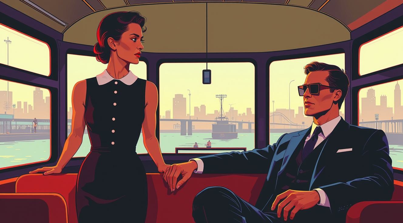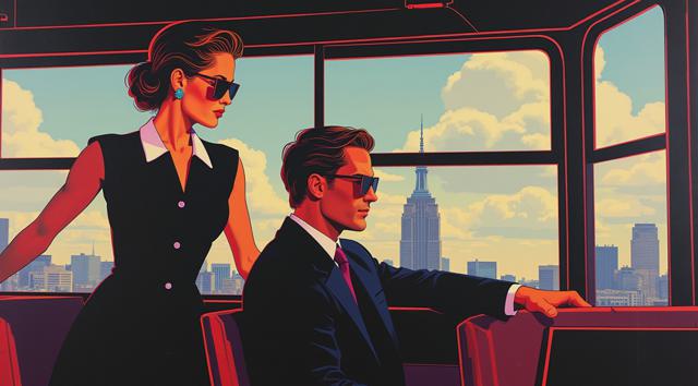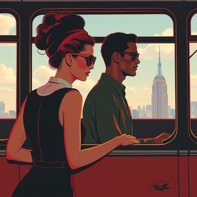 ЖИВОПИСЬ НАРИСОВАННАЯ В СТИЛЕ КАРТИН Jack Vettriano. В ОКНЕ АВТОБУСА ВИДНЫ ЖЕНЩИНА И МУЖЧИНА, В СОЛНЕЧНЫХ ОЧКАХ, ОДЕТЫЕ ПО МОДЕ 1950 ГОДА. ВИДНЫ СО СТОРОНЫ ОКНА ГОРОДСКОГО АВТОБУСА. ЖЕНЩИНА, ОДЕТАЯ В БЕЗРУКАВНОЕ ЧЕРНОЕ ПЛАТЬЕ С БЕЛЫМ ВОРОТНИКОМ И ПУГОВИЦАМИ, СТОИТ ДЕРЖАСЬ РУКАМИ ЗА ОТКРЫТОЕ АВТОБУСНОЕ ОКНО. МУЖЧИНА СИДИТ, ОДЕТ В БЕЛУЮ РУБАШКУ СИДИТ. НА АВТОБУСЕ ГЕРБ ЭМБЛЕМА АВТОБУСНОГО ПАРКА