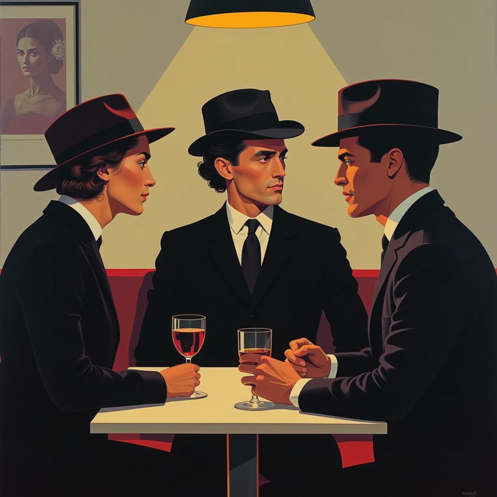 СОВРЕМЕННАЯ ЖИВОПИСЬ , НАРИСОВАННАЯ В СТИЛЕ КАРТИН Jack Vettriano. ЖЕНЩИНА ( ЖЕНЩИНА С ПРИЧЕСКОЙ 1950 ГОДА ) ) В ПРОФИЛЬ И ДВА МУЖЧИНЫ ( МУЖЧИНЫ В ШИРОКОПОЛЫХ ШЛЯПАХ 1950 ГОДА ), АРИСТОКРАТИЧЕСКОЙ ВНЕШНОСТИ, ОДЕТЫЕ В ТЕМНОЕ ПО МОДЕ 1950 ГОДА. СИДЯТ ЗА СТОЛОМ В КАФЕ, ОСВЕЩЕННЫЕ ЛИЦА СВЕРХУ ДЕКОРАТИВНОЙ ЛАМПОЙ С АБАЖЮРОМ . ЖЕНЩИНА ДЕРЖИТ СИГАРЕТУ В РУКЕ, МУЖЧИНА ДЕРЖИТ БОКАЛ. НА СТОЛЕ СТОИТ БУТЫЛКА ФИНА, БОКАЛ, ПАЧКА СИГАРЕТ. НА ЗАДНЕМ ПЛАНЕ КАРТИНЫ ПОЛУОВАЛЬНОЕ ОКНО С ВИДОМ НА ВЕЧЕРНЕЕ НЕБО