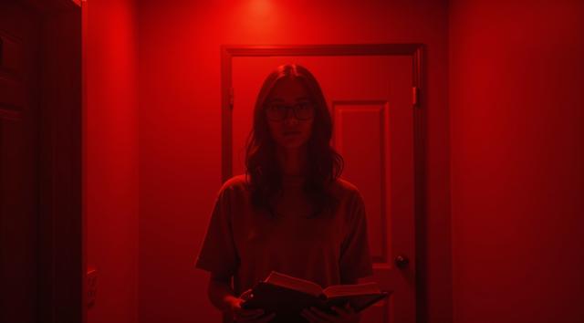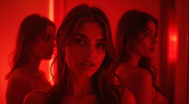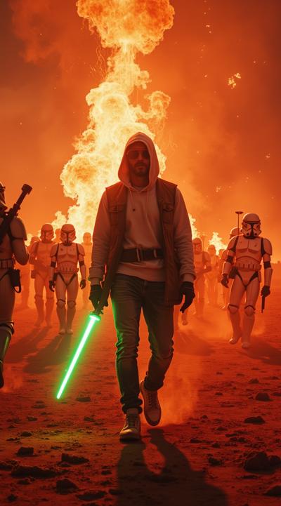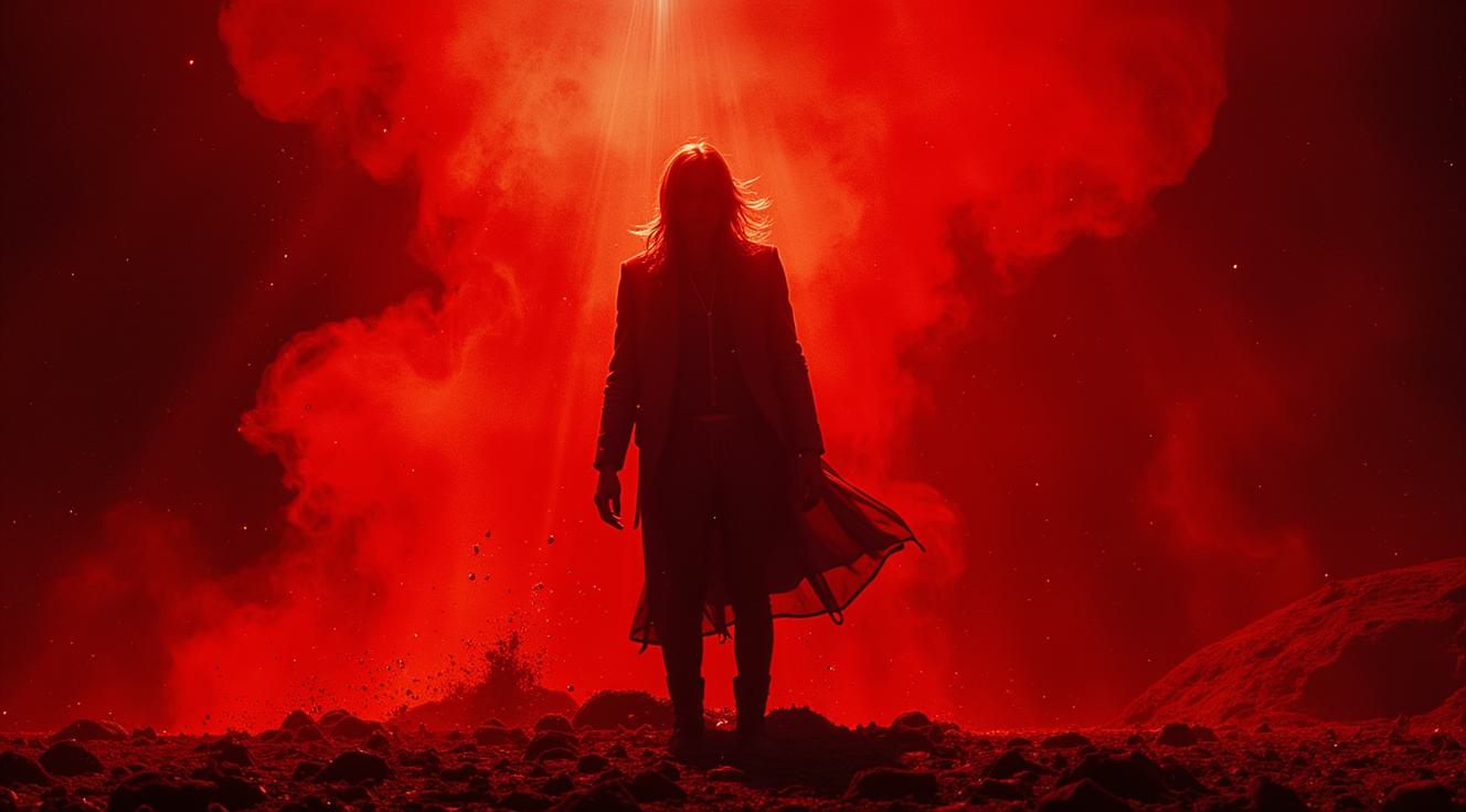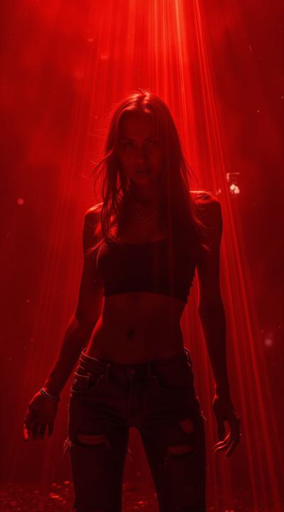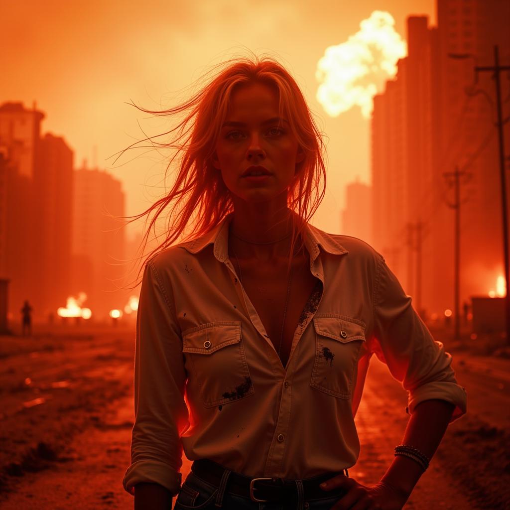 A woman with blonde hair standing at the epicenter of chaos, photorealistic style. Her silhouette is backlit by explosions in the distance, face half-hidden in shadow. Torn white shirt stained with soot, wild unkempt hair flying in the wind. Eyes glowing with fierce determination, one hand raised as if controlling the destruction around her. Behind her — crumbling buildings, swirling debris, lightning strikes. Dramatic chiaroscuro lighting, high detail, 8K resolution, shallow depth of field, cinematic composition —ar 16:9 —v 6