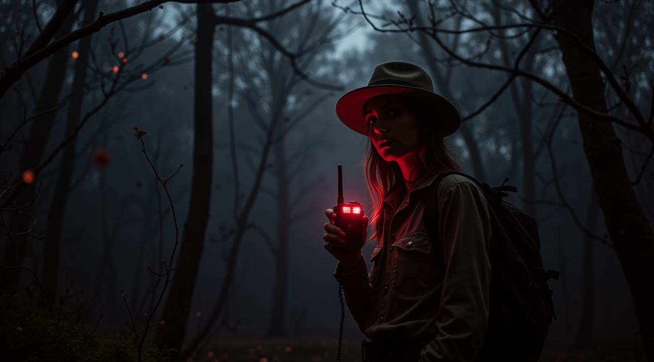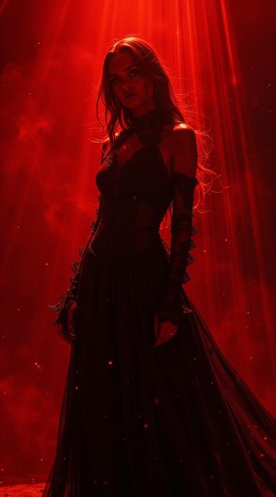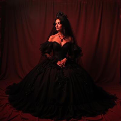 Центральная фигура: женщина в черном свадебном платье, портрет в полный рост, Внешность: детализированное лицо с загадочной мимикой, темные струящиеся волосы, тонкие черты, Костюм: роскошное черное платье с кружевами, объемными рукавами и фатой, диадема с темными цветами, Атмосфера: приглушенный свет, туманный лес/старинная церковь, легкая дымка вокруг фигуры, Стиль: максимальная реалистичность, фотокачество, детальная проработка текстур, Особенности: мягкие светотени, естественные складки ткани, реалистичное падение фаты