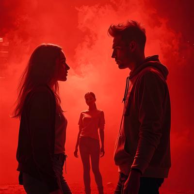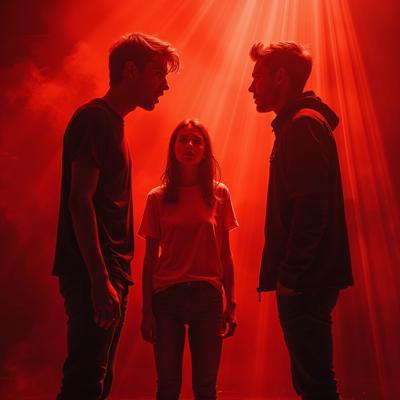 Два молодых парня (возрастом примерно 18 лет) ссорятся и ругаются друг с другом, готовые подраться, а между ними стоит молодая девушка (возрастом примерно 18 лет) с беспокойным выражением лица, пытаясь их помирить и не допустить драки. Один парень - высокий блондин, широкоплечий, стройный, одет в кожаную куртку и джинсы. Второй парень - чуть ниже ростом, широкоплечий , крепкий шатен, одетый в спортивную куртку с капюшоном и джинсы. Девушка - с каштановыми длинными волосами, одета в короткую лёгкую курточку и джинсы. На фоне: осень, вечер, двор пятиэтажного панельного (многоквартирного) дома в России. Современный мир. Иллюстрация в жанре молодёжный любовный роман