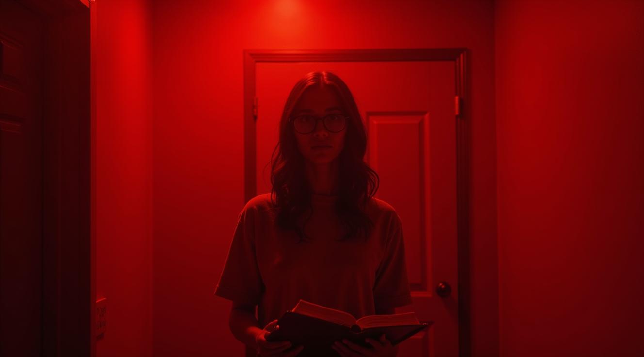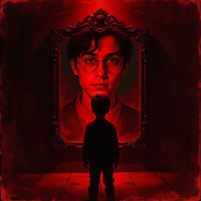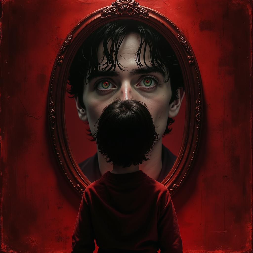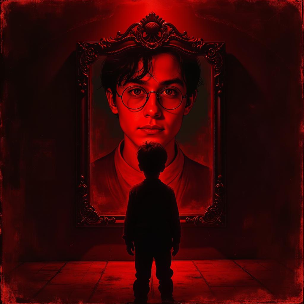 мальчик с темными волосами и зелеными глазами, в очках, стоит один напротив зеркала. В отражении зеркала стоят сам мальчик и взрослый статный темноволосы мужчина лет 45 без очков с красивыми чертами лица и красными глазам. (персонажи рисунка Том Реддл и Гарри Поттер). Темные цвета, мрачная атмосфера