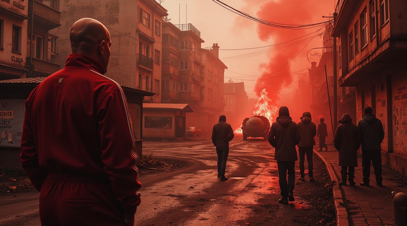 darkly humorous post-soviet crime management scene, a confident gang leader in a tracksuit standing in a rundown city, surrounded by crew members handling cash and dealing with a debtor, small street kiosk being extorted nearby, a pond with a concrete mixer placed beside it as a grim comedic detail, gray apartment blocks and decaying urban environment in the background, old cars and worn textures, gritty atmosphere with slight exaggeration, cold tones with sharp contrast, cinematic composition, detailed stylized game promo illustration