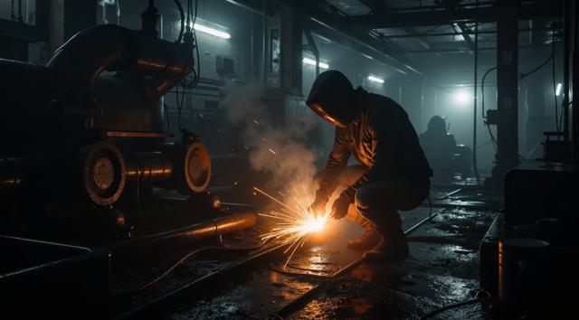 realistic post-soviet industrial horror scene, a lone welder working night shift repairing a leaking pipe, bright welding sparks illuminating a dark factory interior, heavy shadows and wet metal surfaces, steam and dripping water around, a mug of strong dark tea nearby, dim flashlight glow, in the deep background a faint human silhouette barely visible in the darkness watching silently, unsettling atmosphere, gritty textures, cold colors with harsh light contrast, cinematic composition, subtle paranormal tension, detailed realistic game promo illustration