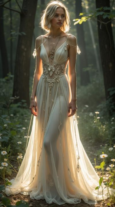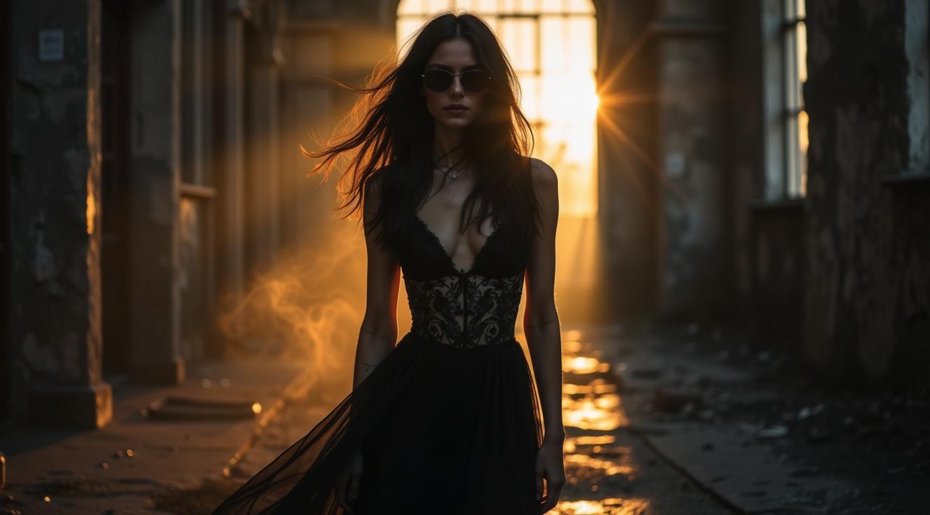 Мистическое тёмное фэнтези. Вампирша-информатор. Длинные чёрные блестящие волосы развиваются. Стильные тёмные очки зеркально отражают солнечные лучи. Уверенная аристократическая походка. Гламурная женская изящная фигура в тёмном строгом готическом платье с высоким вырезом, широкие бёдра. Кружевные чулки. Красные туфли. Хитрая ухмылка. Кружевные чулки и перчатки. Бессмертные прячутся в толпе для выполнения необходимых задач или для более глубоких желаний.