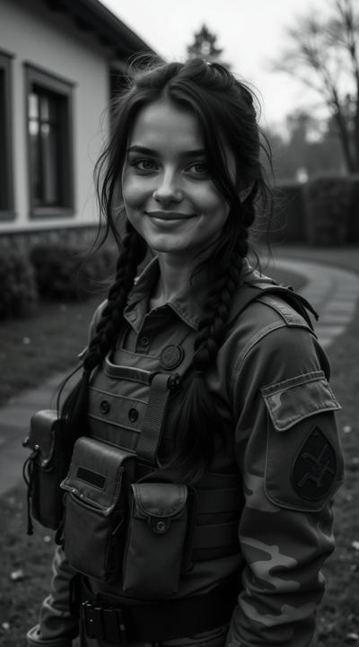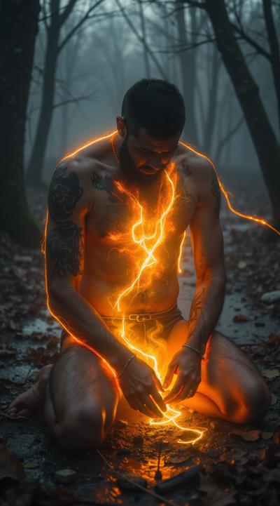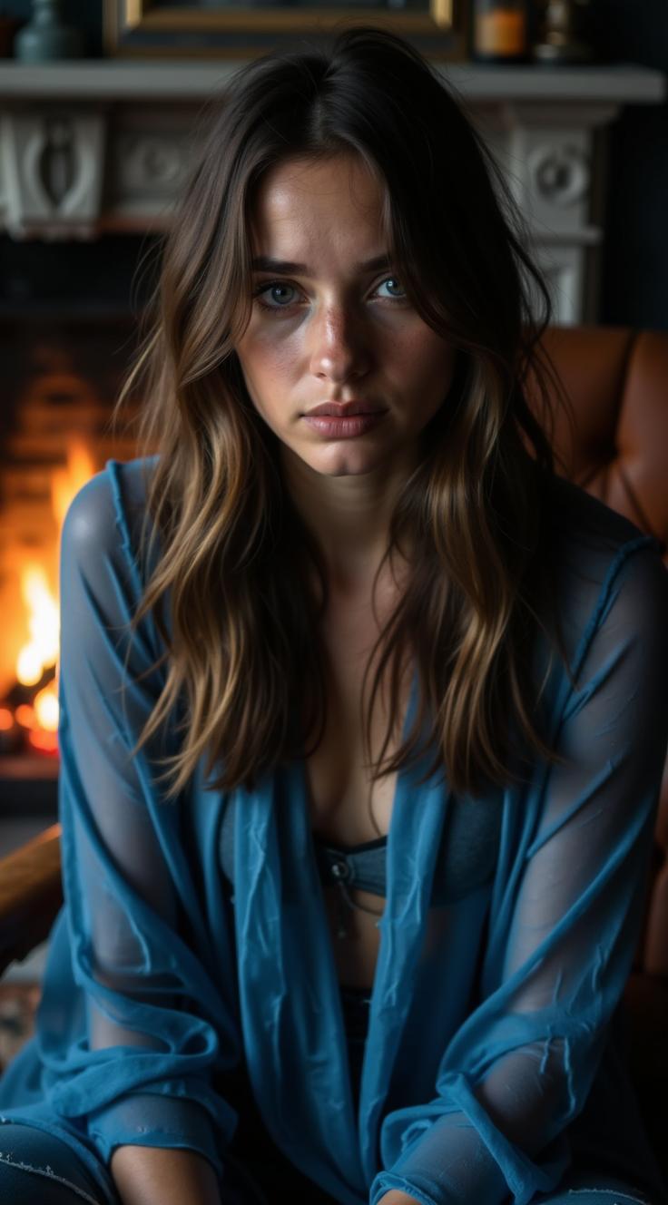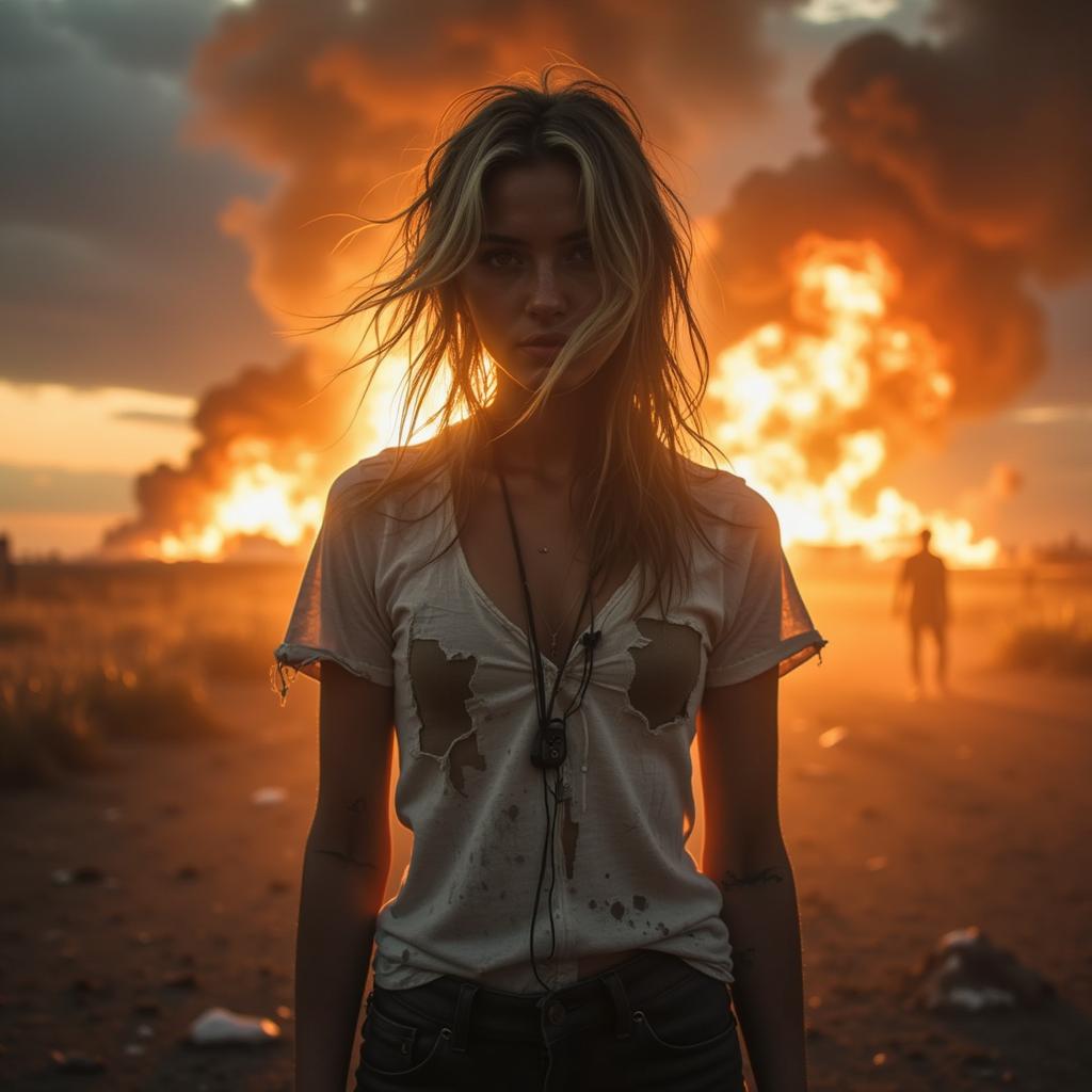 A woman with blonde hair standing at the epicenter of chaos, photorealistic style. Her silhouette is backlit by explosions in the distance, face half-hidden in shadow. Torn white shirt stained with soot, wild unkempt hair flying in the wind. Eyes glowing with fierce determination, one hand raised as if controlling the destruction around her. Behind her — crumbling buildings, swirling debris, lightning strikes. Dramatic chiaroscuro lighting, high detail, 8K resolution, shallow depth of field, cinematic composition —ar 16:9 —v 6